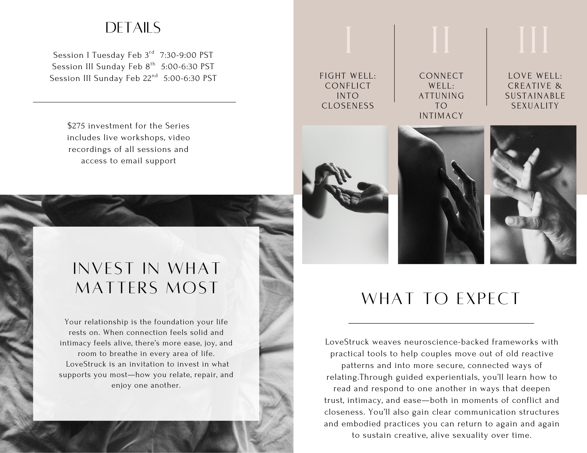 LoveStruck weaves neuroscience-backed frameworks, practical communication tools, and guided experiential practices to help couples move out of old reactive patterns and into more secure, connected ways of relating. This is not about fixing what’s broken—it’s an invitation to invest in your relationship as the foundation it truly is, and to create more ease, closeness, and pleasure at home.